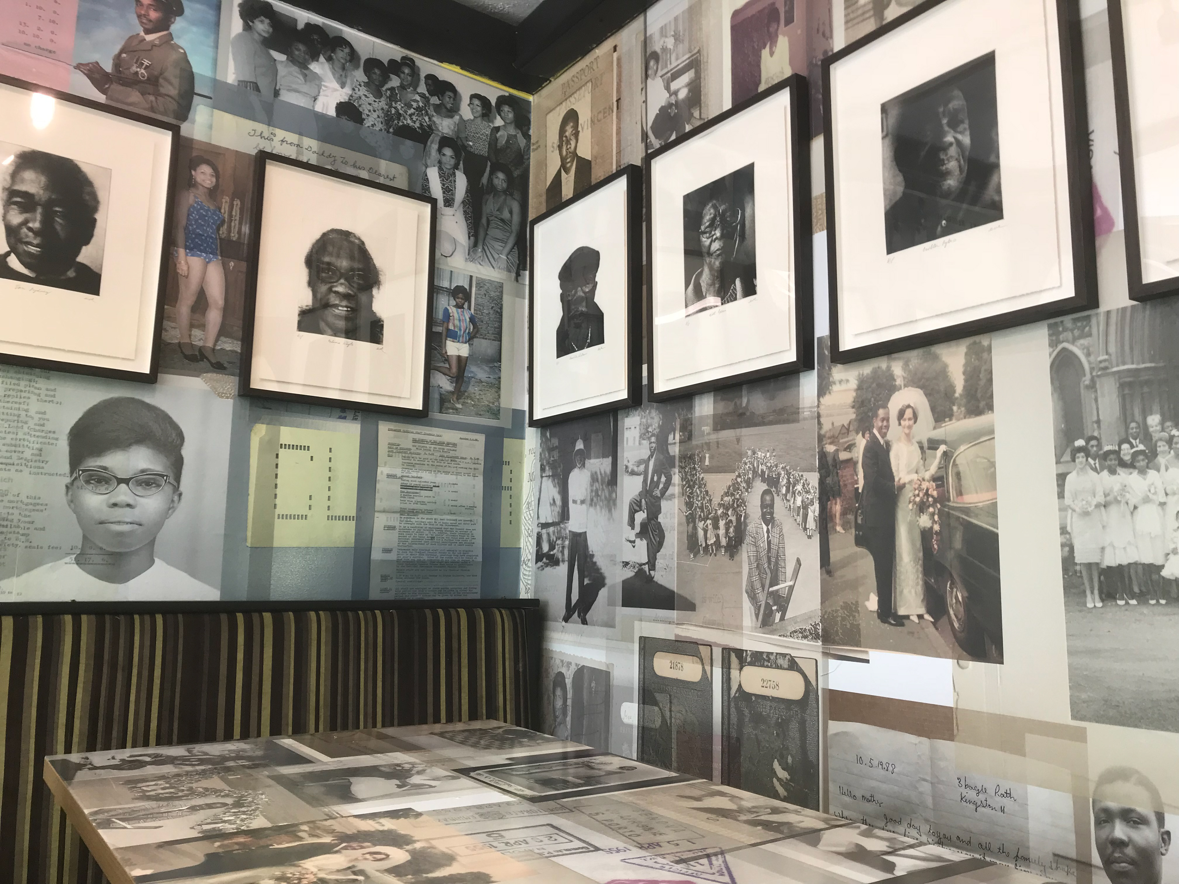 Above photographs: Photo etchings of Alford Gardner Empire Windrush passenger, Lenore Sykes, Alton Watkins, Tina Aparicio, Don Sydney, Gloria Whyte, Hamilton Williams, Nell Green, Carlton Darrell, Carol Sydney. Site specific Art and sound installation detail from SS Caribbean Cafe.. © EVEWRIGHT all rights reserved 2018