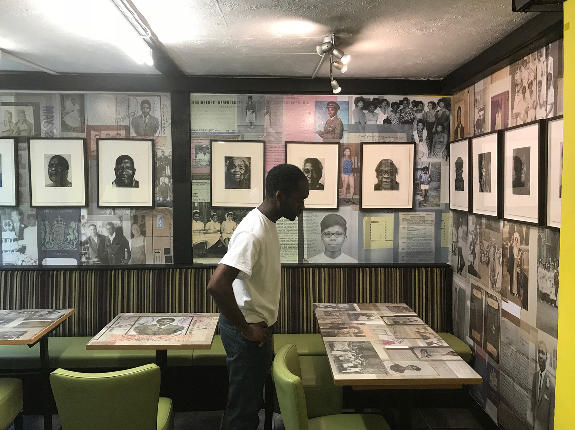 Artist EVEWRIGHT devised a further intervention in the takeaway café space created wall and table collages in conjunction with special limited-edition portraits of the participants using photo etching as a medium. The art installation is an immersive experience which depicts present images but also fading thoughts, aspirations and memories created to document and reflect participants lives. Even some personal documents are shown such as one elder’s original passenger ticket that he bought for his passage to England in 1961 also a letter of a family member in the Homeland asking to receive financial remittance. This project, Caribbean Takeaway Takeover: Identities and Stories, is exhibited free to the public at S&S Caribbean Café & Takeaway, a focus for the black community in Colchester UK. Although the story of migration has always been a current one, this installation helps to give insight into the lives of these ten British adventurers from the Windrush Generation.