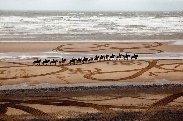 Evewright’s beautiful video ‘Walking Drawings: Across the Estuaries’ in which people and horses create a structure of lines and moods on a beach, takes us to an imaginary place far beyond our normal experience”.