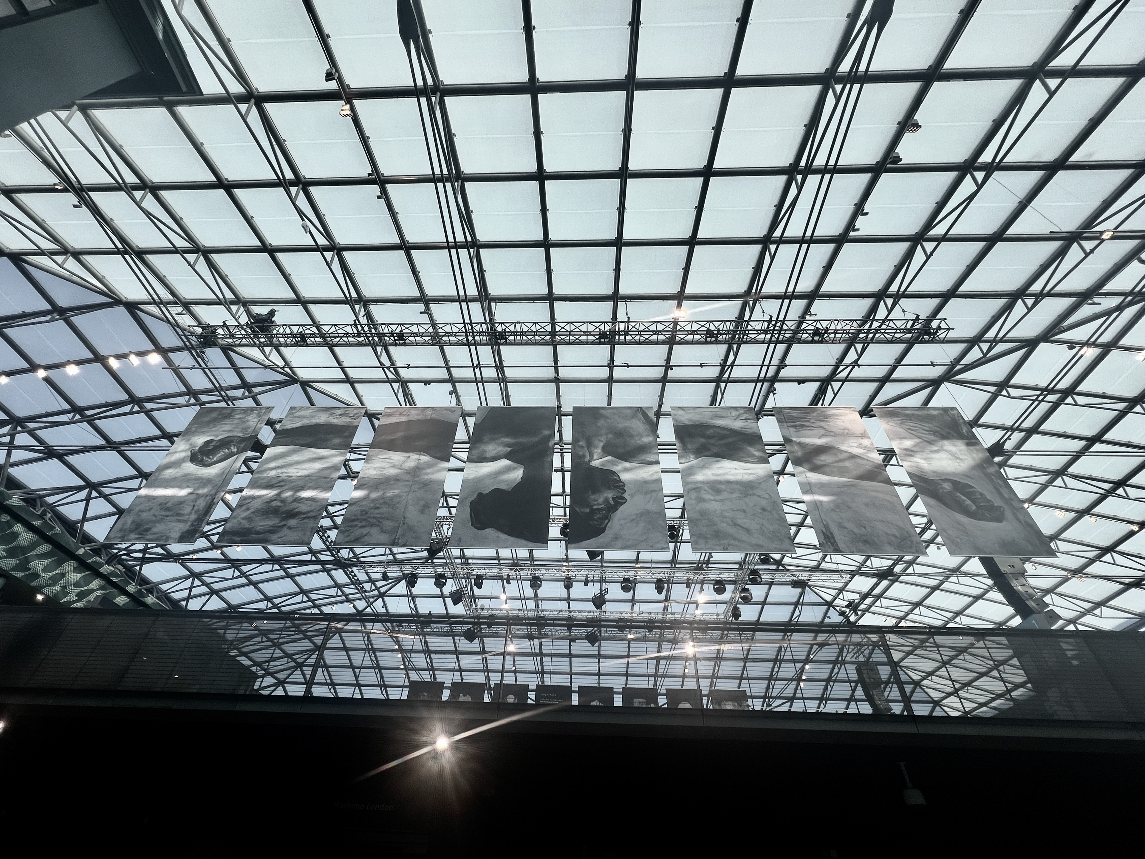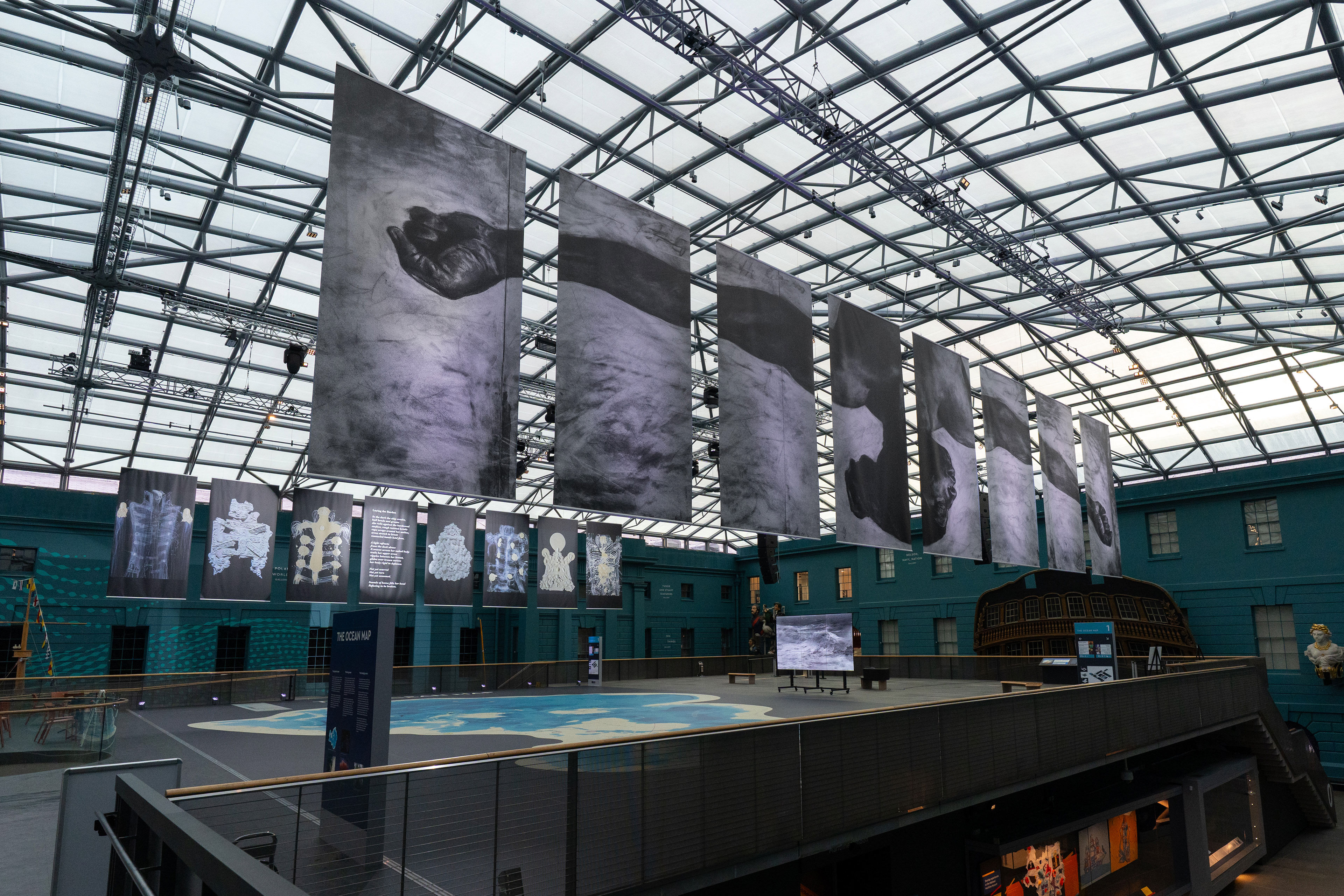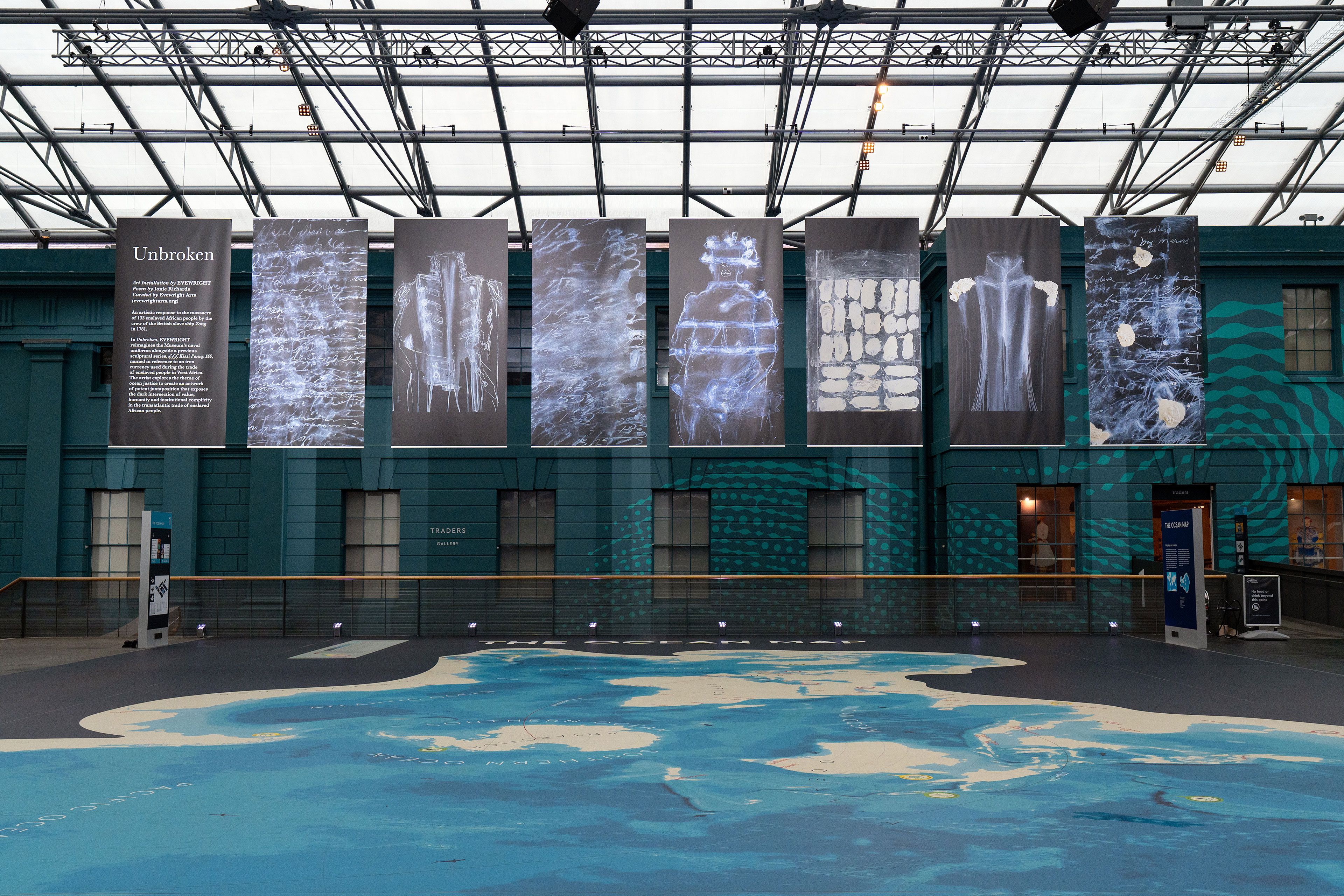 ‘Royal Museums Greenwich is proud to present Unbroken, a powerful new art installation created collaboratively by Evewright Arts, in response to a 5-month residency interrogating the museum’s collections through the lens of Ocean Justice. This new work embodies the complex stories that can be told through museum objects and archives, centring human resilience and the honouring of ancestors in this creative response to the tragic events on board the British slave ship Zong.’