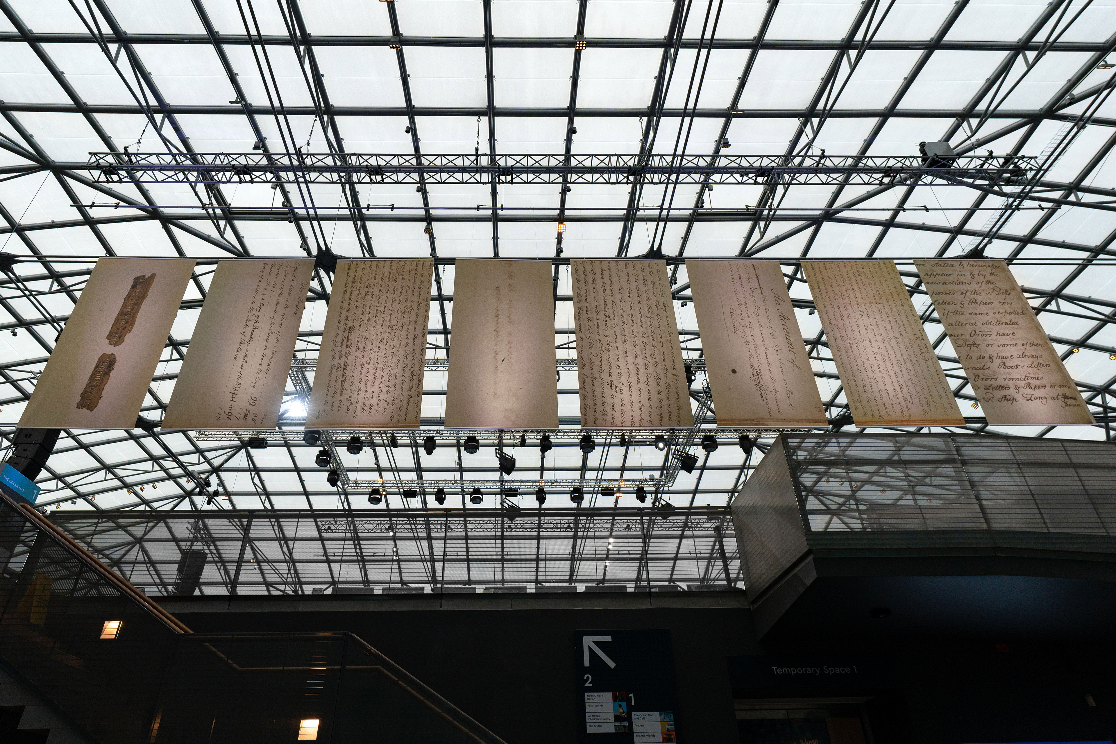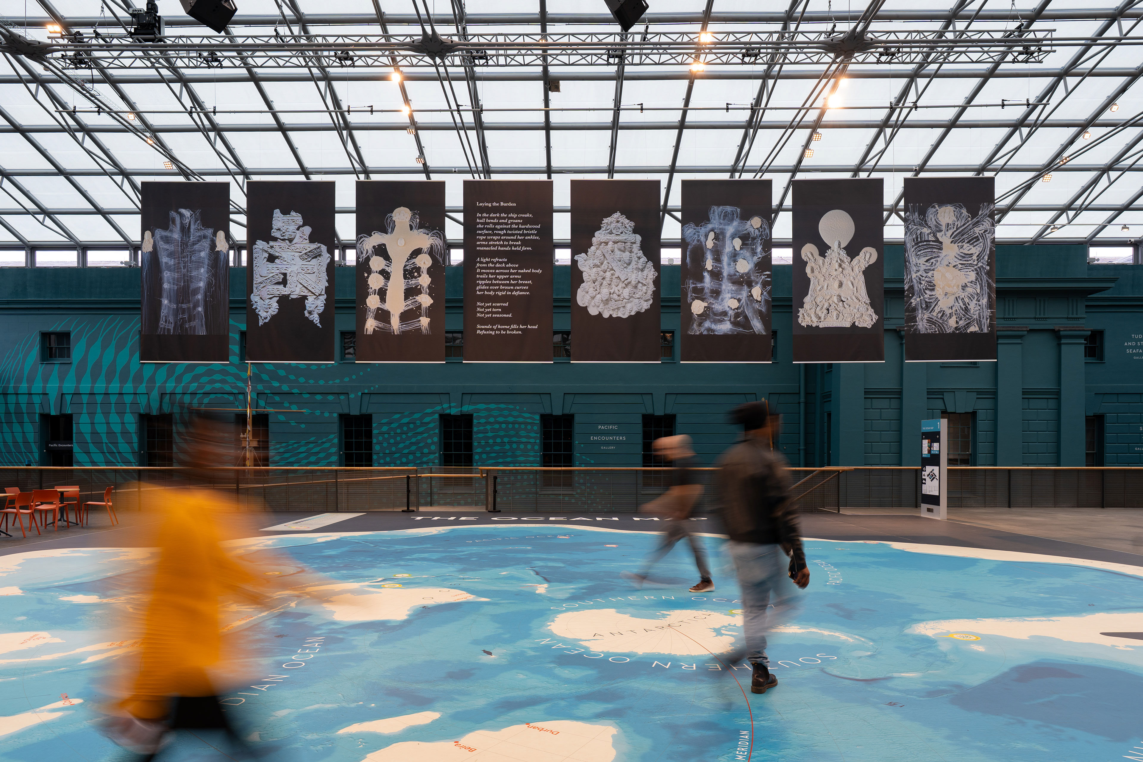 Artist EVEWRIGHT creates a stunning art installation on 16 large banners that spans Ocean Court along with poetry from Ionie Richards. In Unbroken, EVEWRIGHT reimagines the Museum’s naval uniforms alongside a previous sculptural series, £££ Kissi Penny $$$, named in reference to an iron currency used during the trade of enslaved people in West Africa. The artist explores the theme of Ocean Justice to create an artwork of potent juxtaposition that exposes the intersection of value, humanity and institutional complicity in the transatlantic trade of enslaved African people.